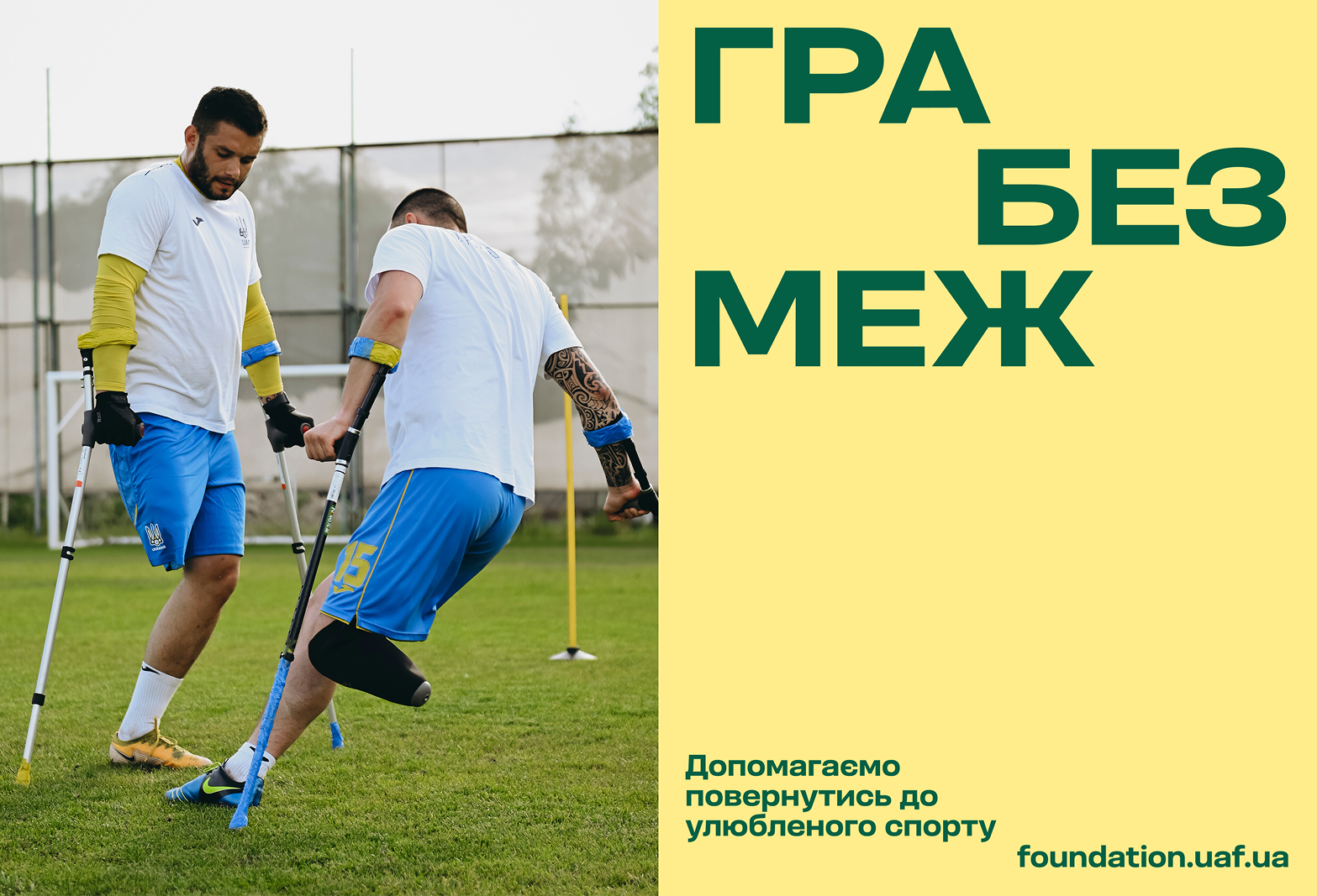 UAF President Andrii Shevchenko stated that working with the trauma of war and implementing social projects are among the key points of the UAF football development program. The UAF Foundation was established to implement initiatives aimed at developing football in Ukraine in three key areas: adaptive, children’s, and women’s football, as well as initiatives related to combating the consequences of war. I’m happy and thrilled and very proud to present the visual identity of UAF Foundation. The Foundation’s logo is the abbreviation UAFF, composed of shapes found on a football field. The colors are the national Ukrainian colors plus the color of green stadium grass. The trident is a simplified form of the logo of the Ukrainian Association of Football, and illustrations are also derived both from the anatomy and shapes of the textual logo, and the trident.